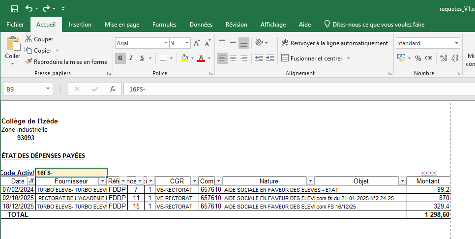 - une nouveauté : le fichier requêtes_V1.xlsb permet de produire confortablement des extraits des dépenses ressemblant à ce qu’on faisait produire par GFC pour justifier les recettes.