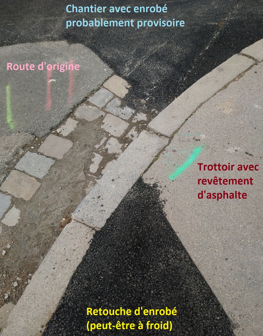 - Enrobé : mélange contenant plus de gravier et moins de bitume que l’asphalte ci-dessus, mais dans lequel les proportions sont encore très variables, avec tout un tas de normes et de qualités possibles.