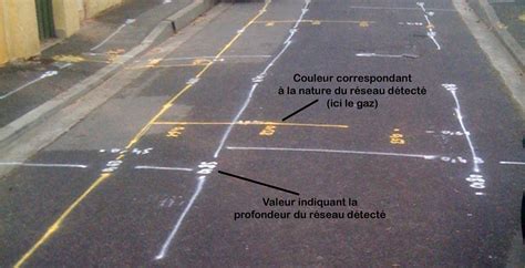 Si vous avez la possibilité d’en savoir un peu plus, par des plans ou d’autres techniques de localisation, les marquages à la peinture pourront utilement respecter les codes de couleur en vigueur pour les différents réseaux, ici la version pour les réseaux enterrés.