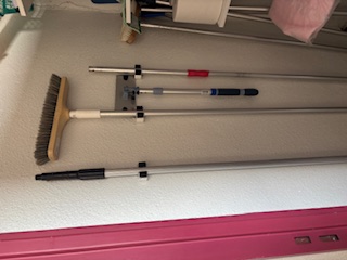 Des crochets ont été installés pour suspendre les balais et racloirs.
