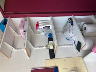 Nous avons choisi de rien laisser traîner par terre. D’abord pour éviter la chute sur le balai qui a glissé en travers du chemin et ensuite, pour éviter aux agents de se baisser pour attraper des produits ou du matériel.