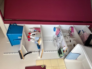 Nous avons choisi de rien laisser traîner par terre. D’abord pour éviter la chute sur le balai qui a glissé en travers du chemin et ensuite, pour éviter aux agents de se baisser pour attraper des produits ou du matériel.